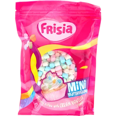 Met de Frisia mini marshmallows versier je al je desserts! Heerlijk op gebak, milkshakes, pannenkoeken, cupcakes en warme dranken. De vrolijk gekleurde mini mallows hebben een zalige roomvanille smaak. Ze blijven lekker zacht in deze hersluitbare verpakking. Geef je desserts een extra portie vrolijkheid!