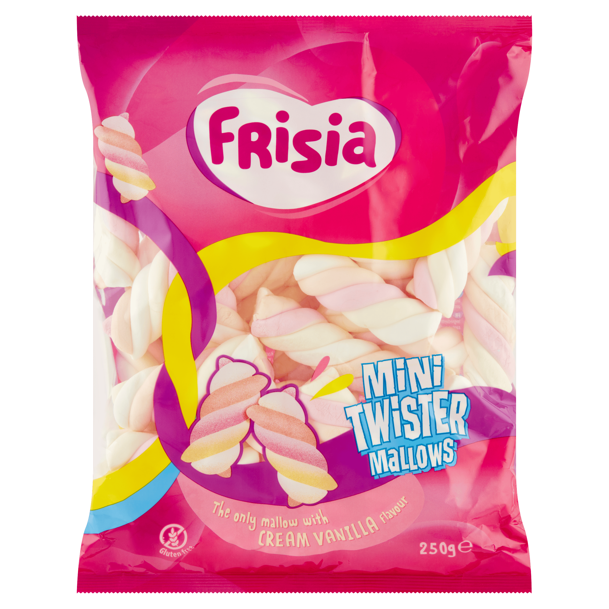 De verdraaid lekkere mini twister mallows van Frisia hebben een heerlijk zachte textuur. De kleurrijke spekjes zijn glutenvrij en hebben een zalige roomvanille smaak. Een tussendoortje om van te genieten!