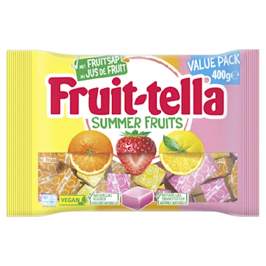 Het hele jaar door genieten van zomerse fruitsmaken met Fruittella Summerfruits! Een heerlijke mix van de smaken sinaasappel, aardbei en citroen in een zak.
