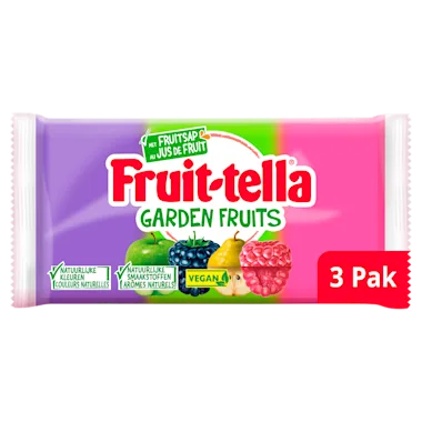 Fruittella Garden Fruits, met snoepjes uit de tuin! Het bekende vierkante Fruittella snoepje in de smaken framboos, appel, peer en braam. Drie rollen in 1 verpakking.