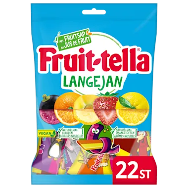 Dubbel zoveel plezier met Fruittella Lange Jan! Twee smaken in een snoepje. Met de heerlijke smaken aardbei/zwarte bes, cola/citroen en sinaasappel/banaan. Er zitten 22 Lange Jan snoepjes in een zak.