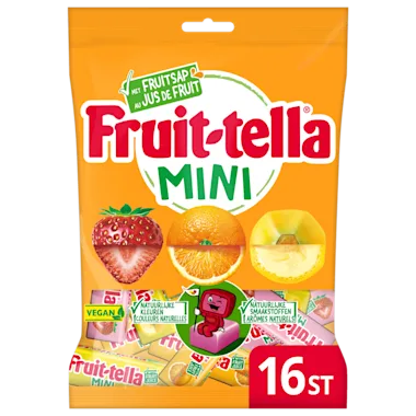 Fruittella Mini's zijn ideaal om te delen. 16 Mini sticks met drie Fruittella blokjes erin. In de heerlijke smaken aardbei, citroen en sinaasappel.