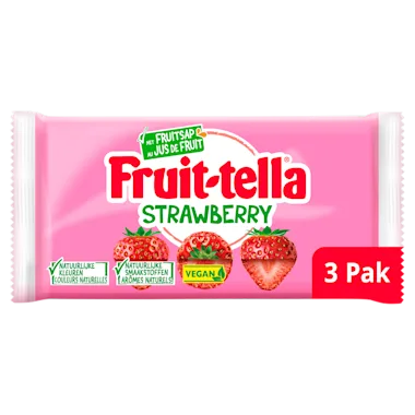 Wij houden van aardbeien, daarom bevat onze Strawberry rol echt aardbeiensap. Geniet van Fruittella Aardbei, het klassieke vierkante aardbeien snoepje! Drie rollen in een verpakking.