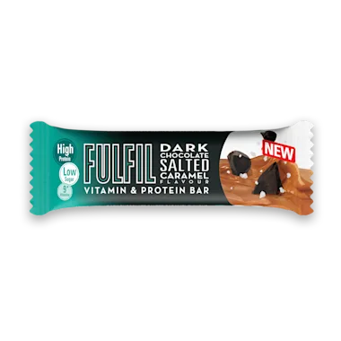 Eiwit- en vitaminereep omhuld met pure chocolade met zoetstof, met laag met zoute karamelsmaak en krokante sojastukjes, met zoetstoffen.