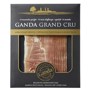 Ganda Ham Grand Cru is een Belgische topper, gemaakt van zorgvuldig geselecteerde hammen van graangevoerde Duroc- en Landrasvarkens. Na een natuurlijke rijping van 12 tot 14 maanden – zonder toevoegingen – ontstaat een heerlijk puur en smaakvol stukje vlees. Perfect om te delen op een borrelplank of om van te genieten bij een goed glas wijn. Een echte traktatie voor fijnproevers!