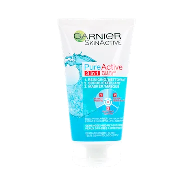 Pure Active 3-in-1 met witte klei combineert 3 reinigingsproducten in één: een reinigingsgel, scrub en masker voor de complete gezichtsreiniging van de huid die last heeft van onzuiverheden. Een gecompliceerde routine is niet meer nodig.