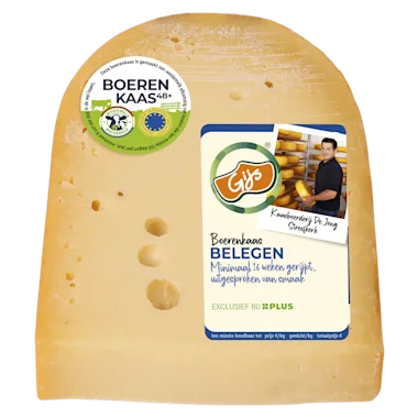 Boerenkaas (GTS) 48+ belegen. Bereid met rauwe melk.