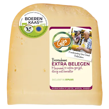 Boerenkaas (GTS) 48+ extra belegen. Bereid met rauwe melk.