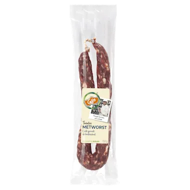 Gebruiksadvies: snij de worst op kamertemperatuur in dunne plakjes, dan komt de smaak het beste tot recht. Eetbaar omhulsel van varkensdarm. Dit natuurproduct kan indrogen en is aan gewichtsverlies onderhevig.