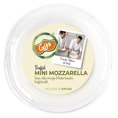 Ingredienten: Buffelmozzarella (buffelMELK, zout, zuursel, stremsel), Opgiet (water, zout, zuurteregelaar: citroenzuur).