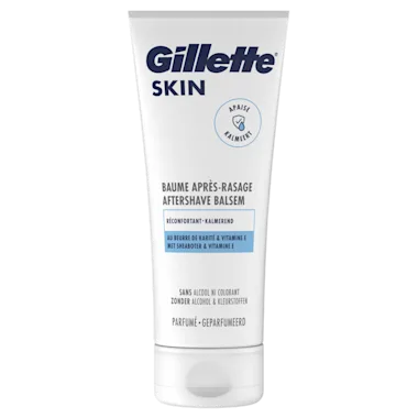 Gillette SKIN Aftershave Balsem heeft een licht geparfumeerde, kalmerende formule verrijkt met sheaboter en vitamine E