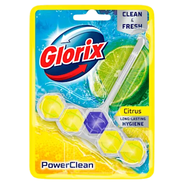 Het Glorix Power Clean Citroen Toiletblok geeft elke spoelbeurt de kracht van Glorix. Het product heeft diverse voordelen. Het reinigend schuim met anti-kalkwerking houdt je toilet lang fris en zorgt bovendien voor glans en een hygiënische reiniging. Zo geniet jij dagelijks van een schoon toilet. De hanger is 100% recyclebaar.
