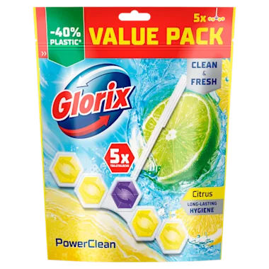 Het Glorix Power Clean Citrus Toiletblok geeft elke spoelbeurt de kracht van Glorix. Het product heeft diverse voordelen. Het reinigend schuim met anti-kalkwerking houdt je toilet lang fris en zorgt bovendien voor glans en een hygiënische reiniging. Zo geniet jij dagelijks van een schoon toilet. De verpakking bevat 40% minder plastic* en de hanger is 100% recyclebaar.