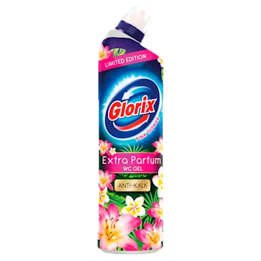 Glorix Pink Flower Toiletreiniger met extra parfum is een toiletreiniger met een frisse, bloemige geur en is geschikt voor dagelijks gebruik om je toilet schoon te maken. De Glorix toiletreiniger verwijdert kalk, reinigt het toilet grondig en hygiënisch en laat ook nog eens een heerlijke frisse geur achter. De unieke dop van Glorix Pink Flower Toiletreiniger met extra parfum zorgt ervoor dat zelfs de meest moeilijke plaatsen in het toilet bereikt kunnen worden. Zo ben je er zeker van dat je toilet altijd glanzend schoon is en heerlijk fris ruikt.