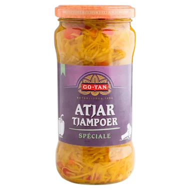 Echte Indonesische Atjar Tjampoer die frisse zoetzure groenten bevat zoals wortel, ui, paprika en witte kool. Atjar Tjampoer is heerlijk om te gebruiken bij Aziatische gerechten zoals Nasi en Bami goreng en saté. Het geeft een frisse smaak en is daarmee een heerlijke topping voor bij jouw Aziatische gerechten. Tip: ook heerlijk door een groene salade!