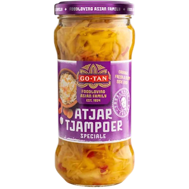 Echte Indonesische Atjar Tjampoer die frisse zoetzure groenten bevat zoals wortel, ui, paprika en witte kool. Atjar Tjampoer is heerlijk om te gebruiken bij Aziatische gerechten zoals Nasi en Bami goreng en saté. Het geeft een frisse smaak en is daarmee een heerlijke topping voor bij jouw Aziatische gerechten. Tip: ook heerlijk door een groene salade!