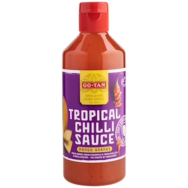 Een licht pittige, fris fruitige chilisaus (zonder knoflook) op basis van pepers, mango en ananas, zonder grove peperpitjes. Heerlijk als tafelsaus.