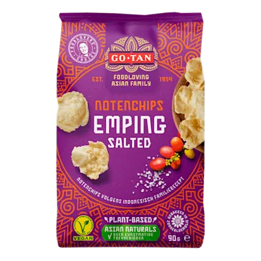 Go-Tan Emping chips salted zijn zeer ambachtelijke, notenchipjes. Na oogst van de melindjo bomen in tuintjes op Java, worden de vruchtjes gerijpt in manden. Midden in het dorp worden ze verzameld en gezamenlijk gepoft, geschild en handmatig geplet. Eén chipje bestaat uit drie tot vijf zaden. Samen worden ze vervolgens in de zon gedroogd. Daarna worden ze rechtstreeks naar Nederland verscheept en door ons in zonnebloemolie goudbruin gebakken en verpakt. Ons familiebedrijf is daarin al decennia dé specialist. Emping wordt gegeten bij de Indische maaltijd of gewoon als snack.