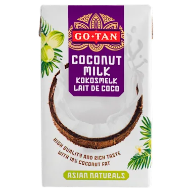 Go-Tan Kokosmelk, klaar voor gebruik in warme gerechten, smoothies en drankjes. Bevat 18% vet, wat staat voor een goede kwaliteit.