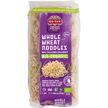 Biologische volkoren noedels zijn een gezonde basis voor de Aziatische maaltijd. De hoeveelheid vitaminen, mineralen, vezels en het lage zoutgehalte maakt deze noedels gezonder dan gewone tarwenoedels.