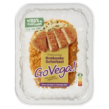 Voorgegaarde plantaardige gepaneerde schnitzel op basis van gehydrateerde soja- en tarwe-eiwitten met toegevoegd ijzer en vitamine B12