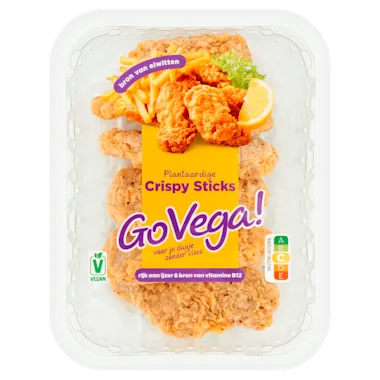Gepaneerde en voorgegaarde veganistische strips op basis van plantaardige eiwitten. Met toegevoegd ijzer en vitamine B12. Ontdooid