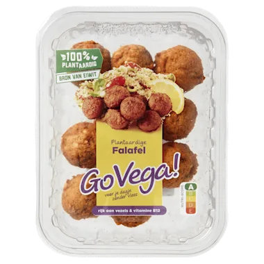 29% gehydrateerde kikkererwten (50% kikkererwt, water), 25% kikkererwten, courgette, ui, plantaardige oliën (zonnebloem, raapzaad, in wisselende verhoudingen), TARWEBLOEM, TARWE-EIWIT, specerijen (komijnzaad, korianderzaad, paprikapoeder, witte peper, kurkuma, gember, lavaswortel, dillezaad, kardemom, venkelzaad, karwij, piment, cayennepeper), knoflookpuree, gedroogde aardappelvlokken, aardappelzetmeel, peterselie, azijn, zout, natuurlijke aroma's, ijzer, vitamine B12.