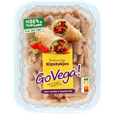 Voorgegaarde plantaardige stukjes op basis van gehydrateerde soja- en tarwe-eiwitten met toegevoegd ijzer en vitamine B12