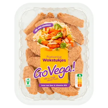 Voorgegaarde, gekruide wokstukjes op basis van soja-eiwit, met toegevoegd ijzer, zink en vitamine B12, ontdooid.