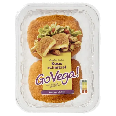 Voorgegaarde vegetarische gepaneerde schnitzel met 63% smeltkaasbereiding.