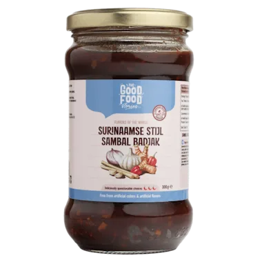 Ingrediënten: gemalen rode peper, ui, suiker, water, zuurteregelaar: E260; kruiden en specerijen, TRASSIE (gefermenteerde GARNALENpasta), zout, kleurstof: E150c), conserveermiddel: E211. Kan bevatten: PINDA's, NOTEN, GLUTEN, SOJA en SESAM.