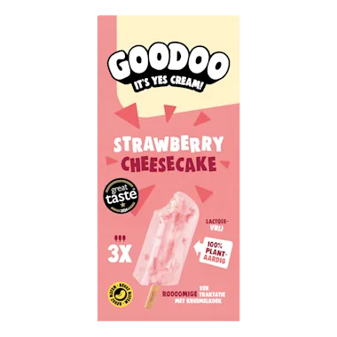 Plantaardig aardbeien-cheesecake ijs met aardbeiensaus (6%) en kruimelkoek (2,5%)