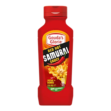 Gouda's Glorie Red Hot Samurai snacksaus is een romige saus met pittige Spaanse pepers. Bekend vanuit België, lekker bij frites en een tosti.