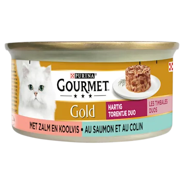 - Bevat fijne stukjes met zalm en koolvis, zorgvuldig gegarneerd met een vleugje saus. Een heerlijke combinatie gepresenteerd als torentje zodat uw kat kan genieten van iedere hap.