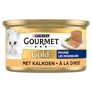 GOURMET™ Gold Mousse: zachte mousse met kalkoen, zorgvuldig bereid om uw kat te plezieren met een delicate en zachte sensatie. Alle GOURMET™ Gold recepten zijn gemaakt met kwalitatief hoogwaardige ingrediënten en bevatten geen toegevoegde kleurstoffen, geen toegevoegde kunstmatige smaakstoffen en geen toegevoegde kunstmatige conserveermiddelen.