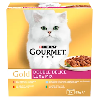 GOURMET™ Gold Luxe Mix zijn heerlijke recepten natvoer om haar verfijnde smaak dagelijks te verwennen met een andere smaakbeleving. Zachte stukjes gecombineerd met zorgvuldig bereide fijne vlokken: de ideale combinatie van twee verschillende texturen in dezelfde maaltijd kattenvoer om uw kat het genot van een subtiele mix van smaken en texturen te bieden. Luxe Mix van GOURMET™ Gold, dubbel genot voor uw kat! Alle GOURMET™ Gold recepten bevatten geen toegevoegde kunstmatige kleurstoffen, conserveermiddelen en smaakstoffen.