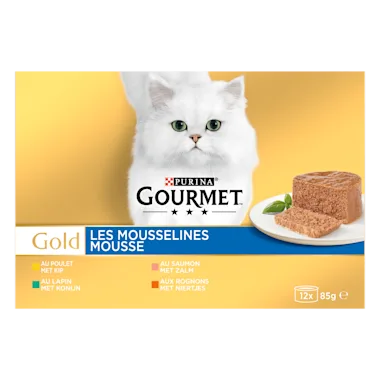 GOURMET Gold Mousse: zachte mousse met konijn, kip, zalm of niertjes, zorgvuldig bereid kattenvoer om jouw kat te plezieren met een delicate en zachte sensatie. Alle GOURMET Gold recepten natvoer zijn gemaakt met kwalitatief hoogwaardige ingrediënten en bevatten geen toegevoegde kleurstoffen, geen toegevoegde kunstmatige smaakstoffen en geen toegevoegde kunstmatige conserveermiddelen.