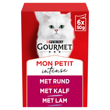 GOURMET Mon Petit Intense is een verfijnde verzameling van werkelijk verrukkelijke recepten kattenvoer die de essentie van smaak vieren. We hebben ingrediënten van hoge kwaliteit en langzaam gegaarde fijne stukjes met rund, lam of kalf in een heerlijke saus geselecteerd om intense smaken vrij te geven voor jouw echte foodie. Ze zullen dol zijn op onze verse kleine porties, voor een echt heerlijke ervaring bij elke maaltijd natvoer. Gemakkelijk te openen, gemakkelijk te serveren, zonder restjes en in een recyclebaar maaltijdzakje. Al onze heerlijke recepten zijn 100% volledig en gebalanceerd voor volwassen katten.