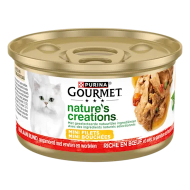 GOURMET™ Nature’s Creations is een collectie van heerlijke recepten geïnspireerd door de natuur. Deze recepten zijn zorgvuldig gemaakt met geselecteerde natuurlijke ingrediënten van hoge kwaliteit, op vakkundige wijze gekookt en rijk aan rund, lam, gevogelte of vis gegarneerd met groenten zoals spinazie, wortelen of tomaten en rijst. Elk uitstekend recept is gemaakt zodat uw fijnproever kan genieten van iedere hap. GOURMET™ Nature’s Creations. Heerlijke maaltijden, geïnspireerd door de natuur.