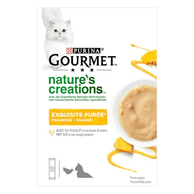 Ontdek GOURMET Nature's Creations Puree met geselecteerde natuurlijke ingrediënten van hoge kwaliteit, voor een smakelijke kattensnack tussen de maaltijden door. Een zorgvuldig samengesteld recept met kip en een vleugje pompoen voor een verfijnde en smakelijke traktatie waar uw kat met plezier van zal genieten. Elke puree is handig geportioneerd en klaar om geserveerd te worden in een kom of direct uit het zakje voor een speciaal moment samen.