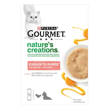 Ontdek GOURMET Nature's Creations Puree met geselecteerde natuurlijke ingrediënten van hoge kwaliteit, voor een smakelijke kattensnack tussen de maaltijden door. Een zorgvuldig samengesteld recept met kip en een vleugje pompoen voor een verfijnde en smakelijke traktatie waar uw kat met plezier van zal genieten. Elke puree is handig geportioneerd en klaar om geserveerd te worden in een kom of direct uit het zakje voor een speciaal moment samen.