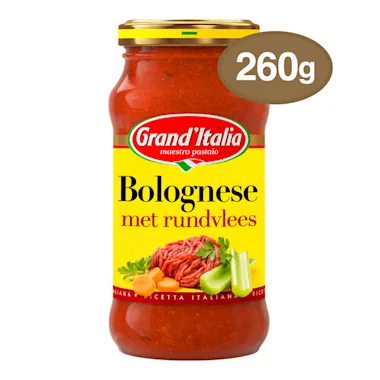 Maak gemakkelijk de lekkerste pasta bolognese met Grand'Italia Bolognese pastasaus; een Italiaanse klassieker, gemaakt met 100% rundvlees, zongerijpte tomaat, ui, wortel en selderij.