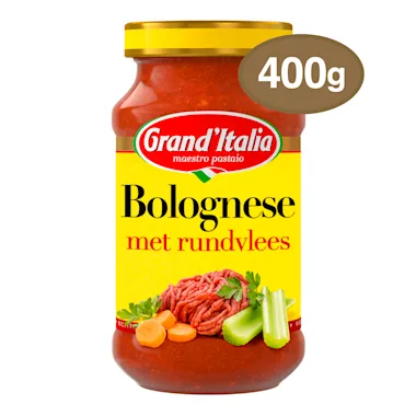 Maak gemakkelijk de lekkerste pasta bolognese met Grand'Italia Bolognese pastasaus; een Italiaanse klassieker, gemaakt met 100% rundvlees, zongerijpte tomaat, ui, wortel en selderij.