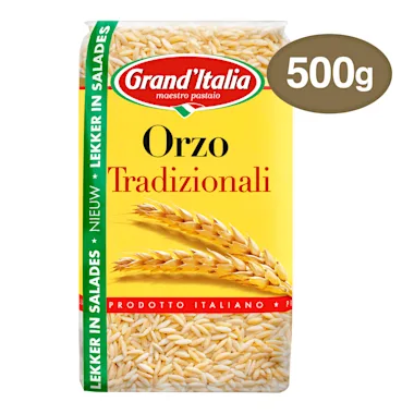 Geniet van Grand'Italia Orzo Tradizionali in een moderne pastasalade of risotto met smaakvolle twist. Deze bijzondere pasta ter grootte van een rijstkorrel wordt gemaakt van 100% kwaliteitsgraan.