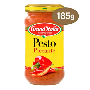 Grand'Italia Pesto Piccante; een smaakvolle pikante pesto, gemaakt met rode paprika en chilipeper. Varieer met deze smaakmaker in de lekkerste pasta pesto piccante. Geniet van iedere hap!