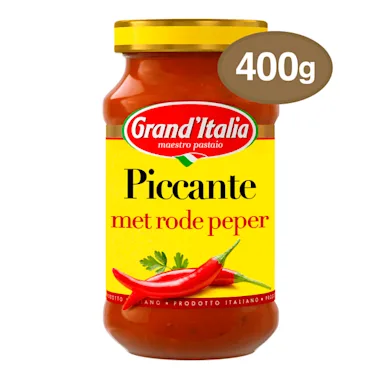 Voeg een vleugje Italiaanse passie toe aan je pasta's met Piccante pastasaus; een licht pikante tomatensaus, met een gebalanceerde mix van zongerijpte tomaat, rode paprika en chilipeper.