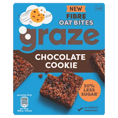 Wat als lekker bezig ook goed bezig was? Met onze graze Chocolate Cookie Oat Bites kun je lekker en verantwoord snacken op elk moment van de dag. Dus of je nu onderweg bent of iets zoekt tegen je middagdip, graze staat voor je klaar met verrassende en lekkere snacks. De graze Chocolate Cookie Oat Bites zijn graanrepen met volkoren havermoutvlokken, verrukkelijke stukjes koek en chocoladestukjes. Deze heerlijke havermoutrepen zijn een perfecte keuze voor bewuste levensgenieters: supper lekker en rijk aan vezels. En dankzij de van nature zoete cichoreiwortel bevat deze snack 30% minder suiker (dan het gemiddelde van vergelijkbare graanrepen). De graze Chocolate Cookie havermoutrepen zijn ook geschikt voor vegetariërs. Bij graze gaat het om twee dingen: smakelijke, verantwoorde ingrediënten en fantasie. Deze combinatie heeft geleid tot snacks met unieke smaakcombinaties en goede voedingswaarden. That’s a graze idea! Onze snacks zijn zeer veelzijdig en daarom het perfecte, verantwoorde tussendoortje. Ze gaan goed samen met een drankje of een goede film. De snacks die vol zitten met proteïne zijn ideaal voor of na een work-out. Al onze snacks bevatten natuurlijke ingrediënten en hebben evenwichtige voedingswaarden – zo bevatten ze altijd proteïne, vezels, essentiële mineralen en vitaminen. We gebruiken bovendien nooit kunstmatige smaakstoffen, kleurstoffen, conserveermiddelen of zoetstoffen.