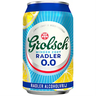Grolsch Radler Citroen 0.0% Minder Zoet is verfrissend van smaak en licht van kleur. Deze alcoholvrije Radler bevat alleen van nature aanwezige suikers. Daardoor is dit alcoholvrije bier minder zoet. Waar en met wie je dit 0.0-bier ook drinkt. Tijd voor elkaar. Tijd voor Grolsch.