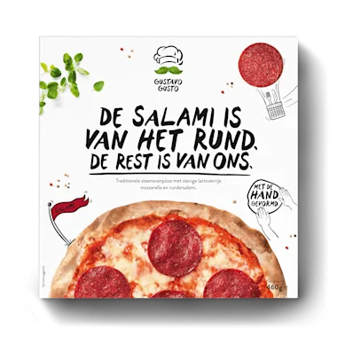 Steenovenpizza ‘Salame’ met tomatensaus, stevige lactosevrije mozzarella en rundersalami. Deels voorgebakken, diepvries