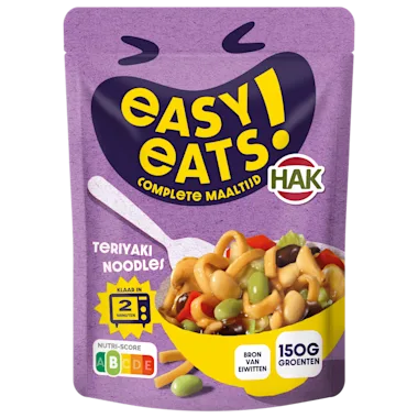 Easy Eats! Teriyaki Noodles Pasta Pomodoro is een complete maaltijd met maar liefst 150 gram groenten. Geniet binnen 2 minuten van deze heerlijke eenpersoonsmaaltijd met noedels, champignons, rode paprika, zwarte bonen, witte bonen en edamame bonen in teriyakisaus.